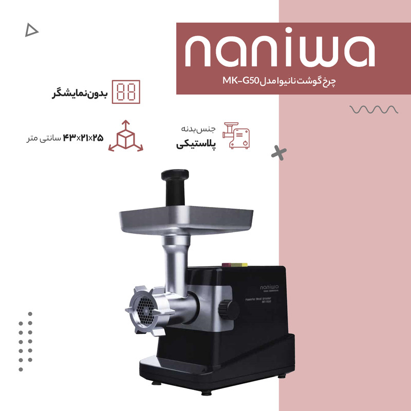 چرخ گوشت، تك كاره برند نانيوا، مدل MK-G50تولیدی از سازنده توليدي لوازم خانگي نانيوا، ايران، تك سرعته، بدون نمايشگر، توان مصرفي 300 W، جنس بدنه پلاستيكي می باشد