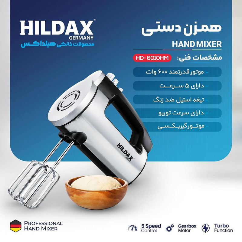 همزن یکی از دستگاه هایی است که کاربردهای فراوانی در آشپزخانه و آشپزی دارد و به نوعی می توان گفت عصای دست آشپزهای حرفه ای و مبتدی می باشد. از این دستگاه معمولا برای هم زدن و ادغام مواد شیرینی و کیک و یا انواع خمیرها استفاده می شود. همزن دستی HD-6010HM یکی از مدل های کارآمد و پر کاربرد شرکت هیلداکس می باشد که با قیمت مناسب و طراحی کاربر پسند تولید و ارائه شده است. این همزن بدون کاسه، قدرتی معادل 600 وات دارد و 5 حالت سرعت را جهت راحتی کار، در اختیار کاربر قرار می دهد تا بتواند به راحتی سرعت لازم را برای مواد سفت و یا معمولی برگزیند. به همراه سرعت های متعدد، این همزن همچنین از حالت Turbo نیز جهت تسریع بخشیدن به حرکت تیغه ها استفاده می کند که این حالت در مواقعی که موادی مانند یخ داخل کاسه باشد و یا بخواهید در مدت زمان کمتری مخلوط آماده شود بسیار مفید است. این همزن دستی هیلداکس با بدنه استیل و با طراحی بسیار زیبا در اختیار کاربران قرار گرفته، به همراه تیغه های اصلی خودش که از جنس استیل ضد زنگ ساخته شده اند.