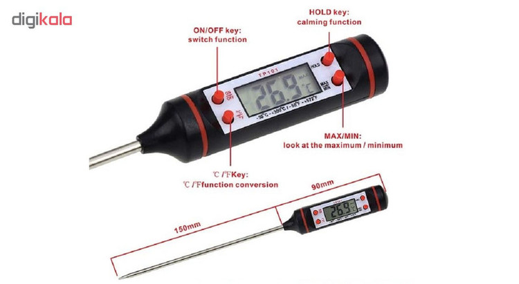 دماسنج میله ای Tp101یکی ازدماسنج هایی می باشد که هم استفاده صنعتی دارد وهم استفاده خانگی ،این مدل برای اندازه گیری دمای مایعات می باشد،درمنزل برای اندازه گیری دمای غذاوآب جوش ومواردی ازاین قبیل ودر محیط های صنعتی هم جهت اندازه گیری موادشیمیایی ومایعات،محدوده اندازه گیری 50-الی 300+ می باشدودارای سیستم خاموشی اتوماتیک بعداز مدتی کارنکردن دستگاه می باشدوقابلیت ذخیره دمارادارد. برای جلوگیری از آسیب احتمالی میله سنجش ، دستگاه در یک محفظه شفاف محافظ ارائه می شود.تغذیه دستگاه را یک باتری AG13 تامین می کند.