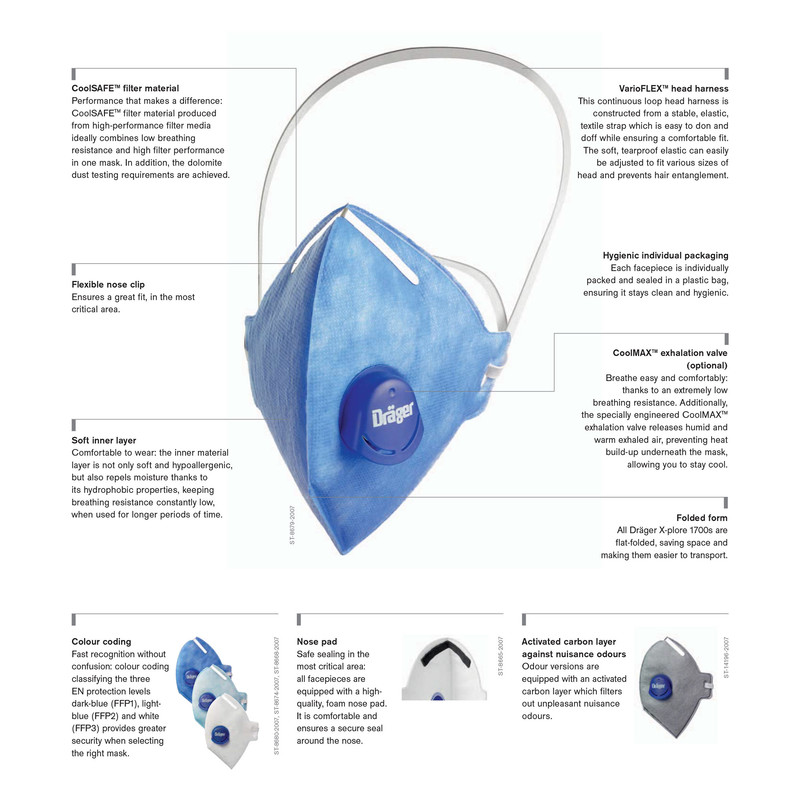 ماسک سوپاپ دار Drager مدل X-plore 1720 V Odour یکی از محصولات برجسته در زمینه محافظت از تنفس کاربران در مواجهه با ذرات جامد و مایع و همچنین ذرات دارای بوی ناپسند می باشد.
