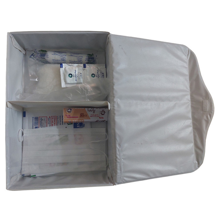 محتویات جعبه کمکهای اولیهباند زخم , پد الکلی , پد چشمی , پنبه , چسب زخم , دستکش , گاز استریل , ماسک