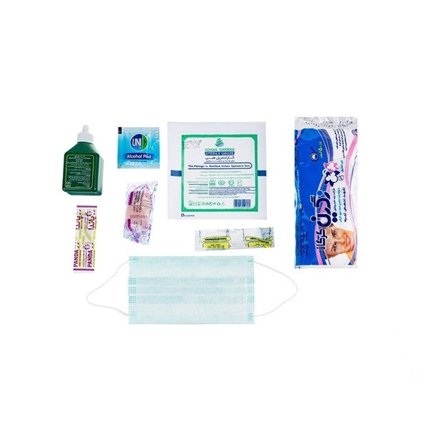 محتویات جعبه کمکهای اولیه: ماسک , چسب زخم , دستکش , گاز استریل , بتادین , باند کشی , باند زخم , پد الکلی , پنبه , پیچ و رول پلاک