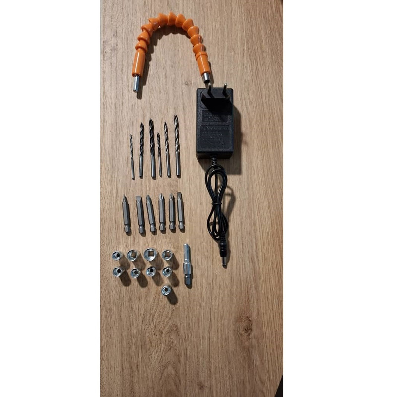 اقلام همراه : شارژر - دو عدد باتری - مته آهن( سایز ۴، ۵، ۶ میلیمتر)، سری مته چوب( سایز ۴، ۵ و ۶ میلیمتر)، رابط فنری تاشونده، انواع نوک پیچ گوشتی دوسو و چهارسو، بکس(سایز ۵، ۶، ۷، ۸، ۹، ۱۰، ۱۱، ۱۲ و ۱۳ میلیمتر) و کمک پایه بلند نوک خور