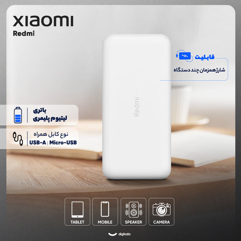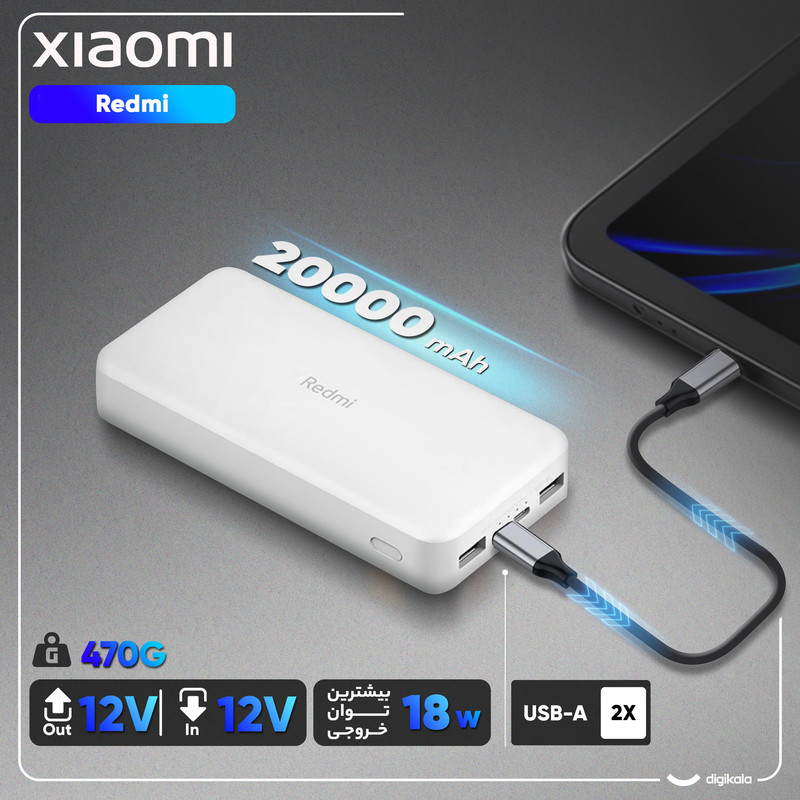 پاور بانک 20000 Redmi شیائومی مدل PB200LZM به همراه یک عدد کابل شارژ 25 سانتیمتری ارائه میشود. این محصول با داشتن دو پورت خروجی USB و پشتیبانی از انواع پروتکلهای شارژ سریع، بهترین همراه شما در خارج از منزل، محل کار و یا هنگام سفر خواهد بود. پاور بانک Redmi با برخورداری از شارژ هوشمند به راحتی میتواند به طور همزمان دو دستگاه را شارژ کند. این محصول با ابعاد 27.3 × 73.6 × 150.5 میلیمتر به راحتی قابل حمل و جابهجایی است. با استفاده از پاور بانک Redmi میتوانید تمامی انواع گجتهای هوشمند مانند دوربین، تبلت، گوشی، و اسمارت واچ را در طول روز شارژ کنید. پاور بانک همراه شیائومی دارای سیستم محافظت در برابر مشکلاتی مانند نوسانات برق، اتصال کوتاه، تغییرات دما، و جریان اضافی در ورودی و خروجی است. شایان ذکر است که حداکثر میزان قدرت برای پورت ورودی 5V _2.1A و پورت خروجی آن 5.1V_3.6A است. این محصول با داشتن دو درگاه ورودی MicroUSB و TypeC با انواع کابلها قابل شارژ شدن است.