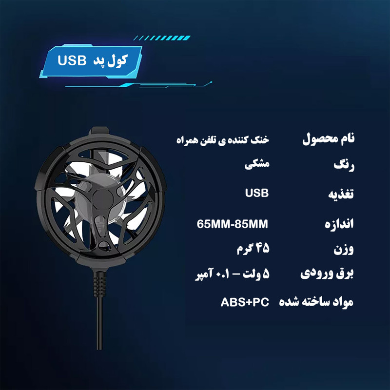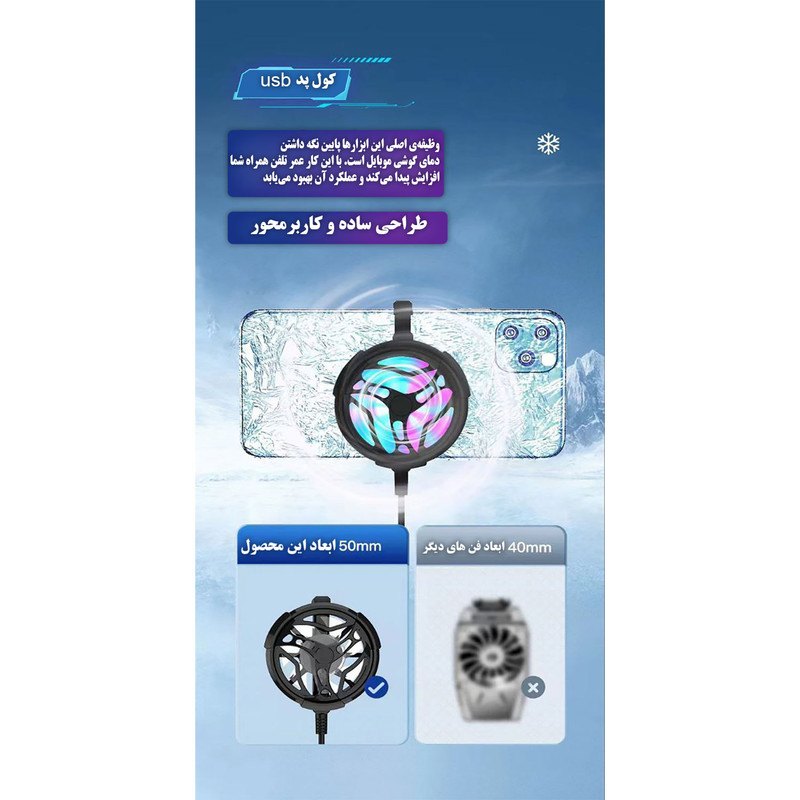 یکی از مشکلات اکثر گوشی های موبایل در هنگام کار کردن و یا بازی کردن داغ کردن بیش از حد می باشد. فن خنک کننده مانع از گرمای بیش از حد گوشی در هنگام بازی کردن کنسول بازی می شود و باعث افزایش عمر گوشی و باتری می شود. یک تولید کننده فن جالبی طراحی و ساخته است که تا حد زیادی به خنک کردن موبایل در حین بازی کمک می کند. این مدل خنک کننده به همراه کابل usb میباشد.