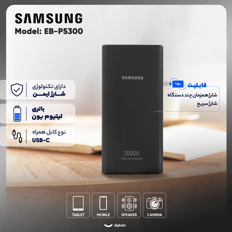 در عصر مدرن که تمامی کارهایی که باید در طول روز انجام شود به صورت اپ و در گوشی قرار گرفته است به یک شارژر همراه نیاز خواهیم داشت. البته این تنها استفادهی این محصول نیست و برای شارژ کردن لپتاپ و حتی تبلت نیز باید از همین مورد استفاده کنید. تصور کنید هر روز بعد از کار باید با تبلت در کلاس آنلاین خود شرکت کنید، در این صورت زمانی که از سرویس برگشت شرکت استفاده میکنید به صورت همزمان در کلاس خود حاضر میشوید و با استفاده از پاوربانک از تمام نشدن شارژ تبلت اطمینان حاصل میکنید. شارژر همراه سامسونگ مدل EB-P5300 در ظرفیت 20000 میلیآمپر تولید و عرضه میشود و به شما این امکان را میدهد تا دو دستگاه مجزا را به صورت همزمان شارژ کنید. این محصول این امکان را به شما میدهد تا از فناوری شارژ سریع استفاده کنید و بدنهی این محصول برای اطمینان از مقاوم بودن آن از فلز ساخته شده است.