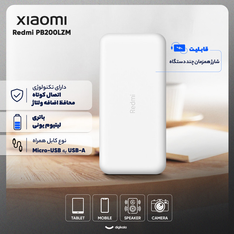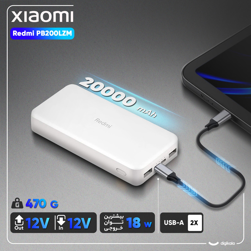 پاور بانک 20000 Redmi شیائومی مدل PB200LZM به همراه یک عدد آداپتور فست سامسونگ و کابل یک متر میباشد ، این محصول با داشتن دوپورت خروجی USB و پشتیبانی از انواع پروتکل های شارژ سریع، بهترین همراه شما در خارج از منزل، محل کار و یا هنگام سفر خواهد بود. پاور بانک Redmi با برخورداری از شارژ هوشمند به راحتی می تواند به طور همزمان دو دیوایس شما را شارژ کند، و شارژ هوشمند ورودی مناسب را برای هر دیوایس در نظر خواهد گرفت. ابعاد این محصول 27.3 × 73.6 × 150.5 میلی متر است و بسیار مناسب ، راحت وکه میتوانید تمامی گجت های هوشمند خود را مانند : دوربین ، تبلت ، گوشی ،اسمارت واچ..... خود را در طول روز شارژ کنید. پاور بانک همراه شیائومی دارای سیستم محافظت در برابر مشکلاتی مانند نوسانات برق، اتصال کوتاه، تغییرات دما، اضافه جریان در ورودی و خروجی و غیره است. این پاور بانک از پورت خروجی دوگانه USB_A و پورت ورودی دوگانه USB-C و MicroUSB بهره برده است. شایان ذکر است که حداکثر میزان قدرت برای پورت ورودی 5V _2.1A و پورت خروجی آن 5.1V_3.6A است و دارای دودرگاه MicroUSB - TypeC و سازگار با تمامی گجت های هوشمند شماست .