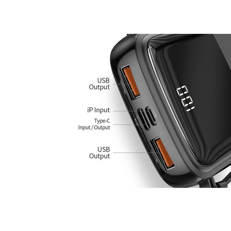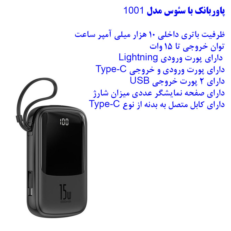 طراحی مینی، شارژ همزمان 4 دستگاه، قابلیت شارژ سریع و دارای نمایشگر دیجیتالی از برخی قابلیت های این پاوربانک است. بهرهگیری از پروتکلهای QC3.0 و PD3.0 15W جهت شارژ سریع با سرعت فوق العاده بالا از دیگر مزیت های پاوربانک 1001 است. این پاوربانک دارای دو عدد پورت USB مجهز به فناوری QC3.0، یک عدد پورت Type-C دو طرفه مجهز به فناوری PD3.0 و یک عدد کابل تایپ سی متصل با قابلیت تبدیل شدن به بند مچی همراه را دارد. ولتاژ و شدت جریان خروجی دو عدد پورت یو اس بی: 5V/3A، پورت تایپ سی: 5V/3A، کابل تایپ سی: 5V/3A است. شارژ ایمن در برابر اتصال کوتاه، افزاش جریان، ولتاژ، تخلیه شارژ، حرارت و ریست شدن با قابلیت تشخیص خودکار جریان دستگاه و تنظیم ولتاژ و جریان مطابق با آن نیز مزیت هایی است که این پاوربانک داراست. این پاوربانک مجهز به دو عدد پورت ورودی Type-C و Lightning جهت تامین انرژی مورد نیاز خود است. همچنین دارای نشانگر LED دیجیتالی جهت نشان دادن میزان شارژ باقیمانده نیز می باشد
