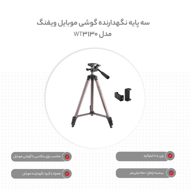 وزن : 640 گرم بیشینه تحمل وزن : 2.5 کیلوگرم بیشینه ارتفاع : 1250 میلیمتر طول در هنگام بسته بودن : 420 میلیمتر به همراه گیره نگهدارنده موبایل
