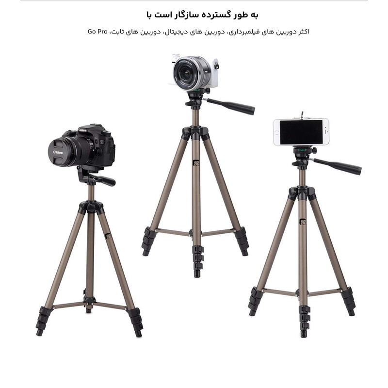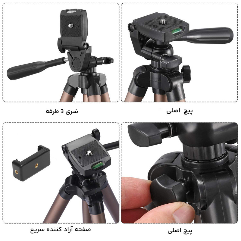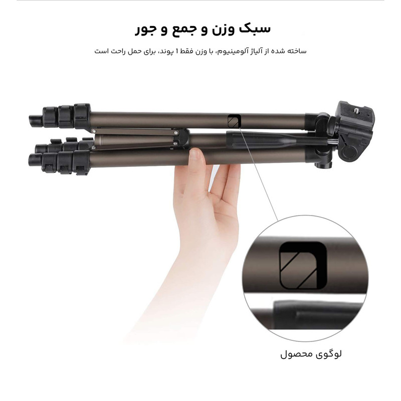 وزن : 640 گرم بیشینه تحمل وزن : 2.5 کیلوگرم بیشینه ارتفاع : 1250 میلیمتر طول در هنگام بسته بودن : 420 میلیمتر به همراه گیره نگهدارنده موبایل