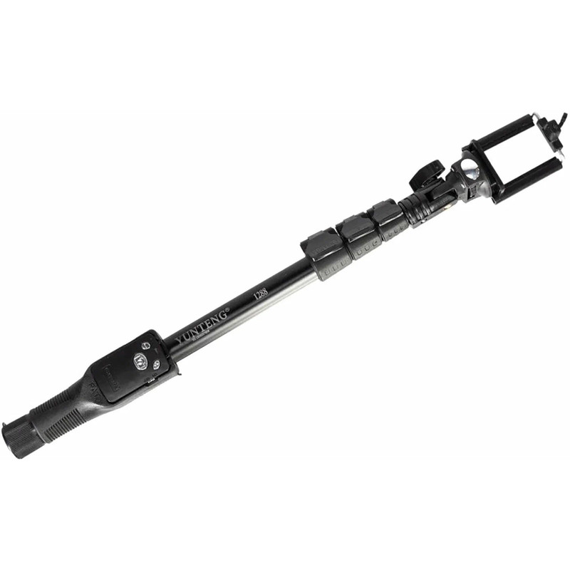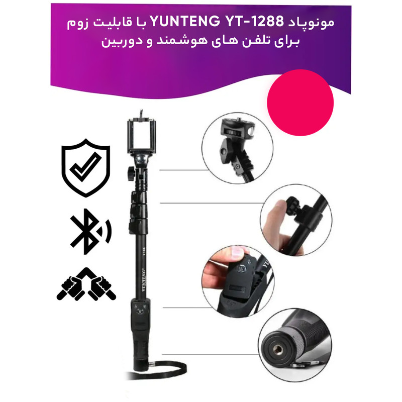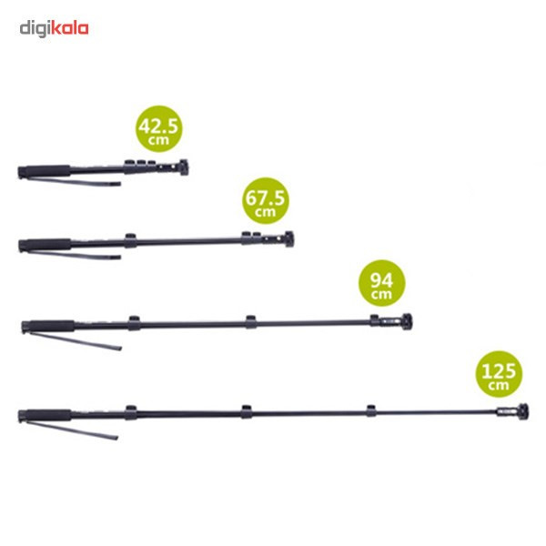 پایهی مونوپاد «یانتنگ» مدل «YT-1288» با طول حداکثر 125سانتیمتر، ابزاری مناسب برای عکاسی سلفی با گوشیهای کوچکتر از 5.5 اینچ است. این محصول بدنهای از جنس آلومینیوم دارد که از چهار تکهی تلسکوپی تشکیل شده است. این تکهها بهوسیلهی گیرههای پلاستیکی به هم محکم میشوند و پس از بازکردن همهی تکهها، طول مونوپاد به 125 سانتیمتر میرسد. کمترین طول هم در حالتی که تمام تکهها جمع شدهاند، 42.5 سانتیمتر است. این محصول به لطف گریپ لاستیکی دندانهدارش، بهراحتی در دست نگهداشته و کنترل میشود. قسمت نگهدارندهی گوشی، به پایهای متصل شده که از قابلیت چرخش 360 درجه و خموراستشدن برای تنظیم زاویهی دلخواه برخوردار است. در پایین این قسمت، یک آیینهی محدب کوچک تعبیه شده که به کمک آن میتوان بهتر کادربندی کرد. افرادی که به گرفتن عکس سلفی تمایلی ندارند، میتوانند آن را روی سهپایهی دوربین قرار دهند و به کمک ریموتکنترلی که روی بدنهی مونوپاد قرار گرفته و قابل جداشدن از بدنهی مونوپاد است، اقدام به عکاسی کنند. ریموتکنترل این محصول دارای دکمههایی برای زوم، خاموش و روشن کردن و دکمهی شاتر است. به همراه این مونوپاد یک کابل microUSB هم ارائه میشود که برای شارژ ریموتکنترل به کار میرود. این محصول تنها 235 گرم وزن دارد و ریموت کنترل آن با گوشیهای اندروید نسخهی 4.3 و iOS نسخهی 6.0 به بالا سازگار است.