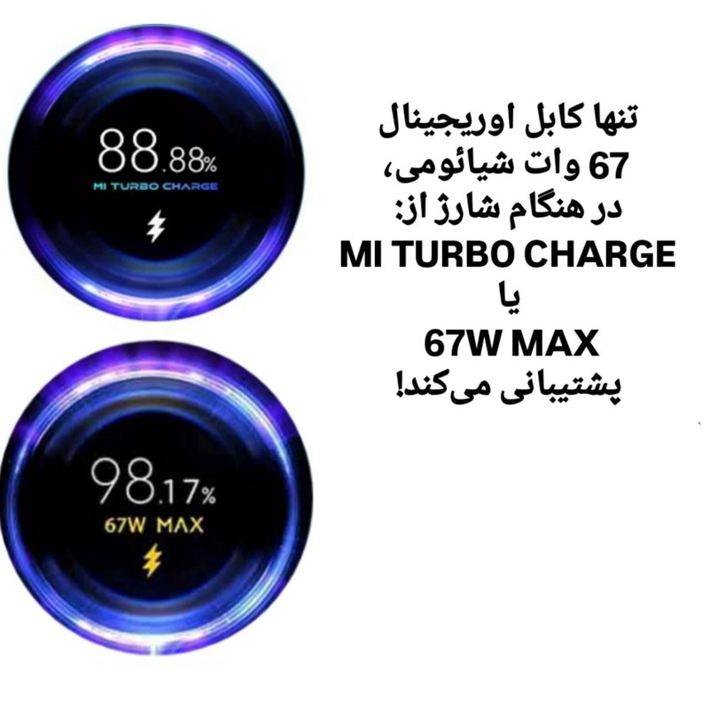 کابل 67 وات اوریجینال برند شیائومی، با پشتیبانی از درصد ریز شمار با خروجی 6 آمپر و توان 67 وات Turbo ، و همچنین سازگار با انواع مدل های پایین تر چون ؛ 33 وات ، 22.5 وات یکی از بهترین گزینه ها برای خرید کابل است.