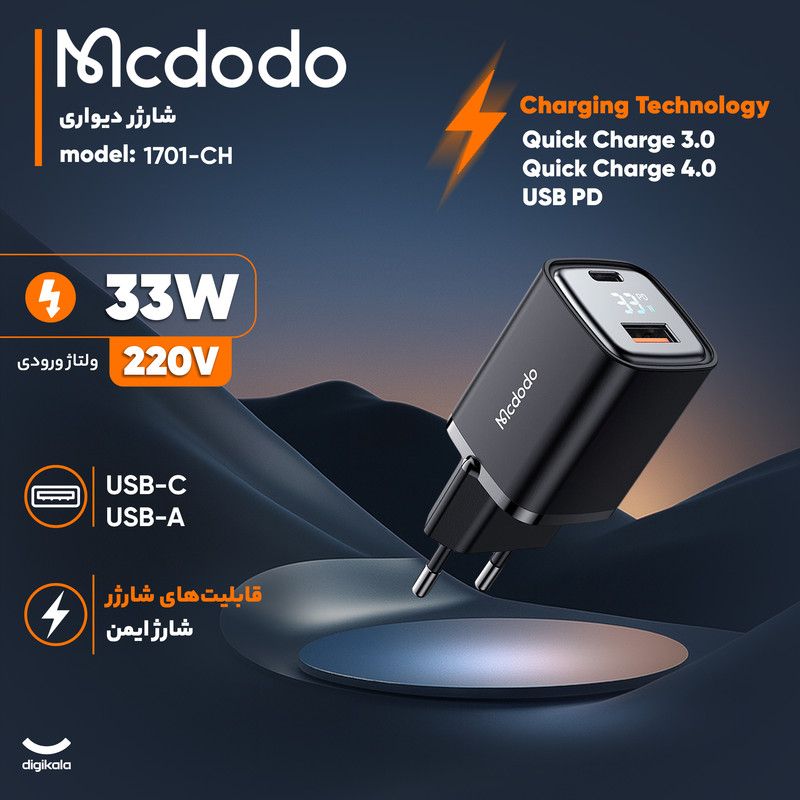 شارژر دیواری ۳۳ وات مکدودو مدل CH-1701 یک محصول کوچک، سبک و کارآمد برای شارژ سریع گوشیها و تبلتها است. این شارژر با وزن ۶۳ گرم و بدنهای از جنس پلاستیک مقاوم طراحی شده و اتصال آن به برق از طریق دوشاخه استاندارد ایران انجام میشود، که امکان استفاده راحت در خانه، محل کار یا سفر را فراهم میکند.