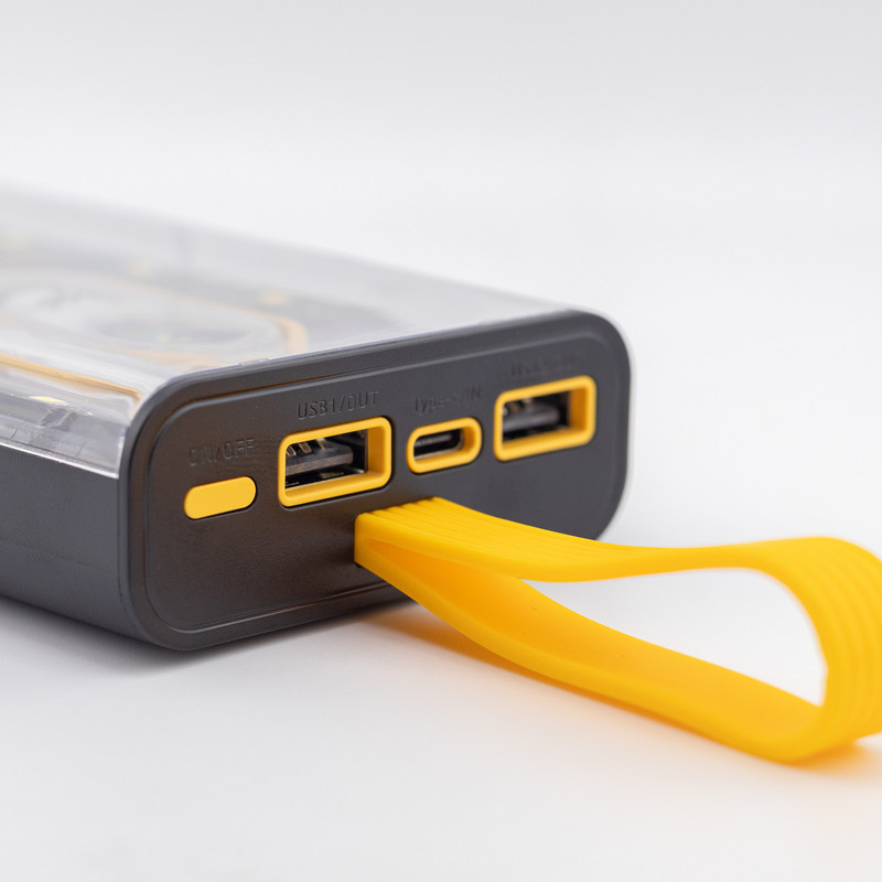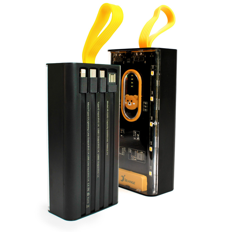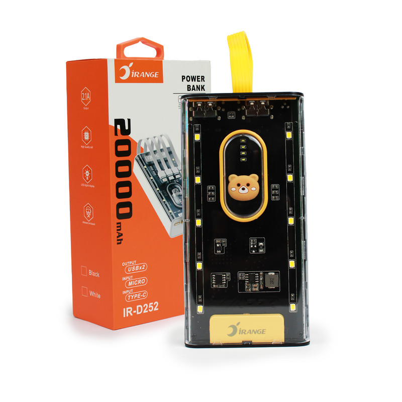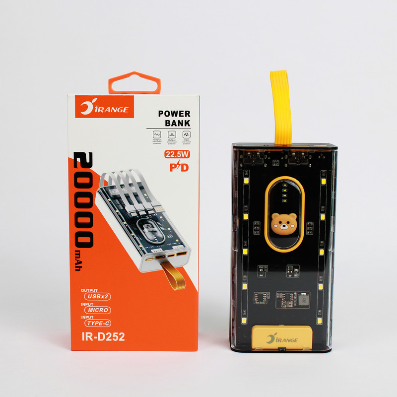 پاوربانک شفاف آیرنج مدل D252 ظرفیت 20000 میلی آمپر با طراحی خلاقانه و شفاف به شما اجازه می دهد تا مدار و چیپ های داخل پاوربانک را ببینید. این پاوربانک دارای 7 خروجی و 2 ورودی می باشد ، وجود 4 کابل یکپارچه متصل به بدنه شما را از حمل کابل شارژ اضافه بی نیاز می کند. این محصول دارای دو پورت خروجی USB با توان 22.5 وات و یک پورت Type-C با توان 20 وات می باشد و از قابلیت شارژ سریع QC و PD پشتیبانی می کند. جنس بدنه این پاوربانک از مواد درجه یک پلاستیک PC و ABS ساخته شده که بسیار مقاوم و ضد ضربه بوده و یک نشانگر LED بر روی بدنه قرار گرفته تا میزان درصد شارژ باتری را نشان دهد. پاوربانک 20000 میلی آمپر ساعتی آیرنج مدل D252 از قابلیت شارژ ایمن پشتیبانی می کند و از دستگاه ها در برابر افزایش دما، اضافه ولتاژ و اتصال کوتاه محافظت می کند. این محصول با تمامی دستگاه ها سازگاری دارد و وزن آن در حدود 440 گرم میباشد. اگر به دنبال یک منبع برق قوی با سرعت شارژ بالا و همچنین دارای چراغ LED برای مسافرت و کمپینگ یا استفاده در فضای باز هستید این پاوربانک گزینه جذابی برای شما به شمار می رود.