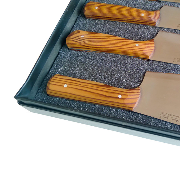 این محصول سرویس 6 پارچه چاقوی آشپزخانه می باشد که جنس تیغه ها از استیل زنگ نرن و جنس دسته ها از چوب ضد آب می باشد