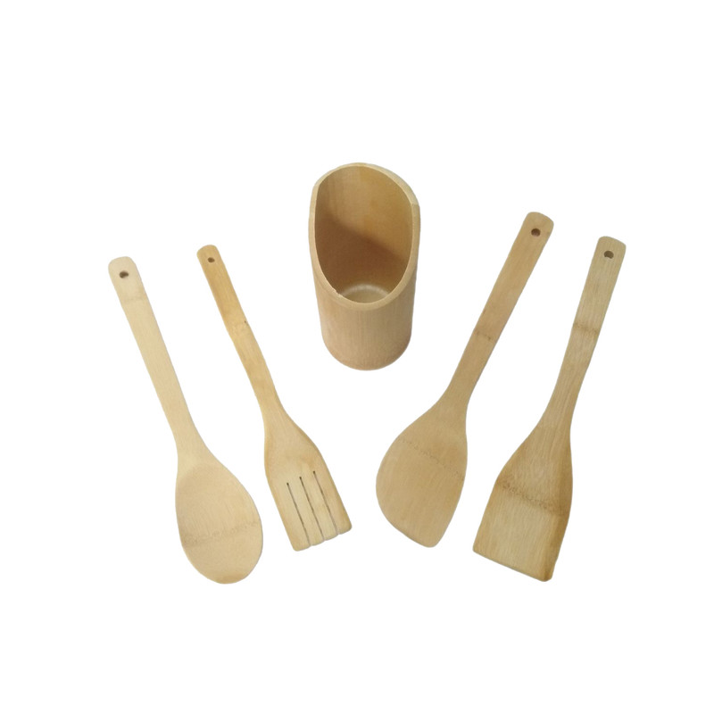 دو عدد کفگیر و یک عدد قاشق و یک عددچنگال چوبی در یک استند استوانه ای از جنس چوب بامبو