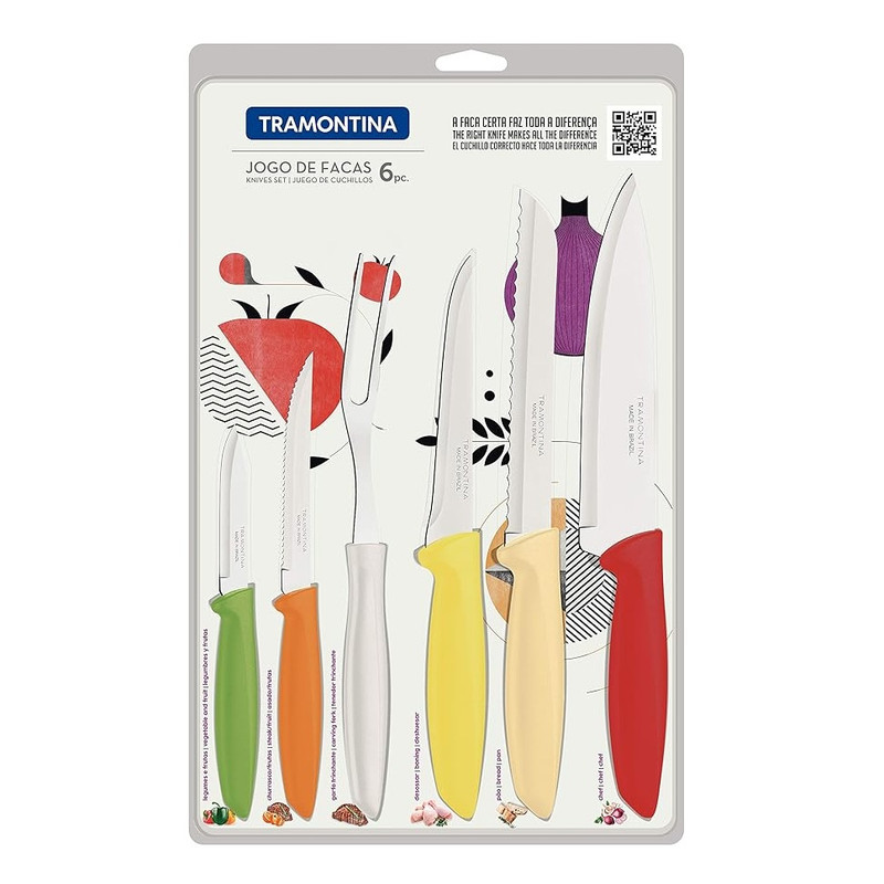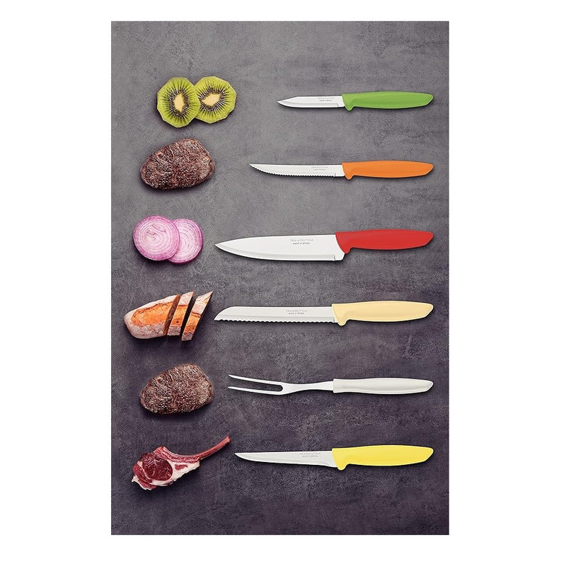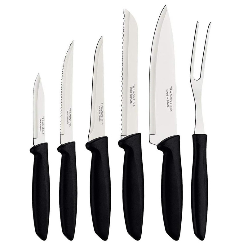 با ست ۶ پارچه چاقوی ترامونتینا مدل Plenus کیفیت و کارایی را به آشپزخانه خود بیاورید. این مجموعه برای استفاده روزمره کاملاً ایدهآل است و با تیغههای ساختهشده از استیل ضدزنگ سختکاریشده، برشهایی دقیق، سریع و روان را برای شما فراهم میکند. دستههای پلیپروپیلن مقاومت و دوام بالایی دارند و کار با چاقوها را راحتتر میکنند. این چاقوها بسیار کاربردی هستند و قابل شستوشو در ماشین ظرفشویی می باشند تا در وقت شما در آشپزخانه صرفهجویی شود. این سرویس شامل چاقوهای سرآشپز، برش نان، قصابی، استیک، پوست گیری و یک چنگال آشپزی می باشد.