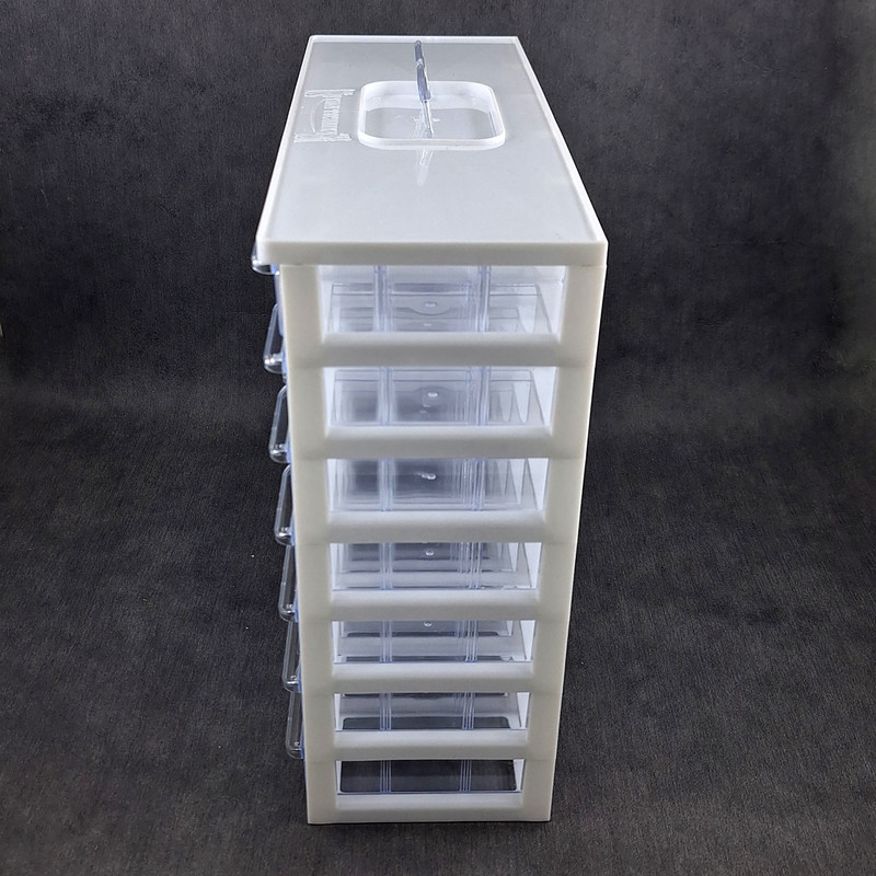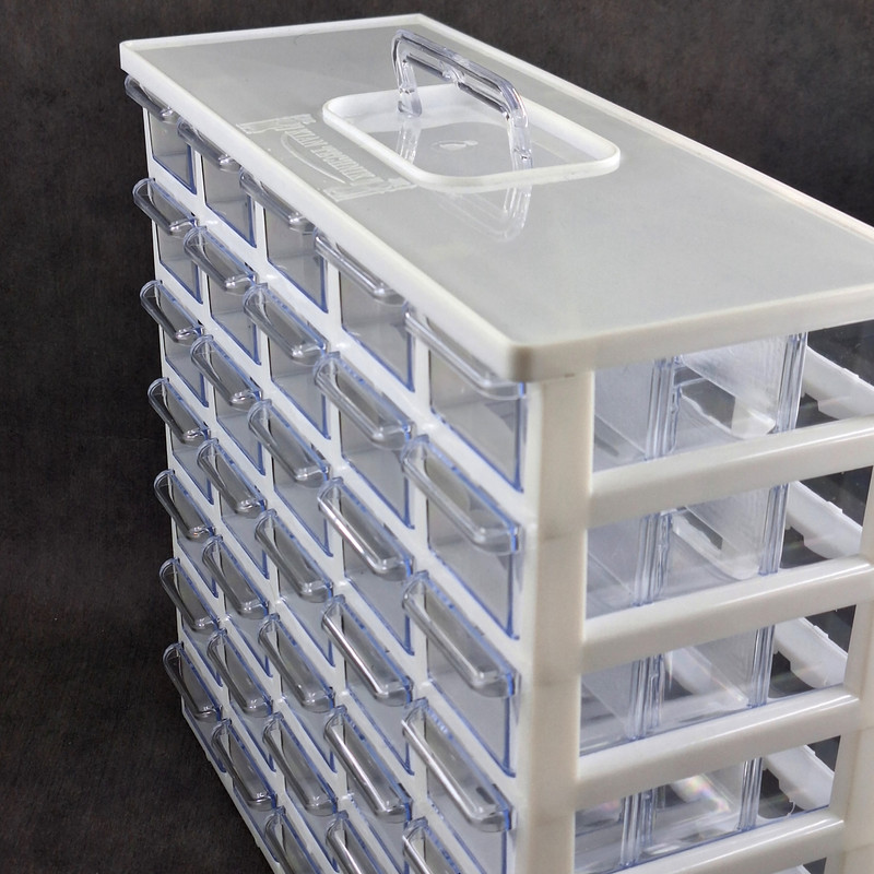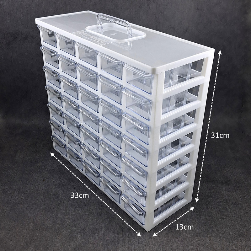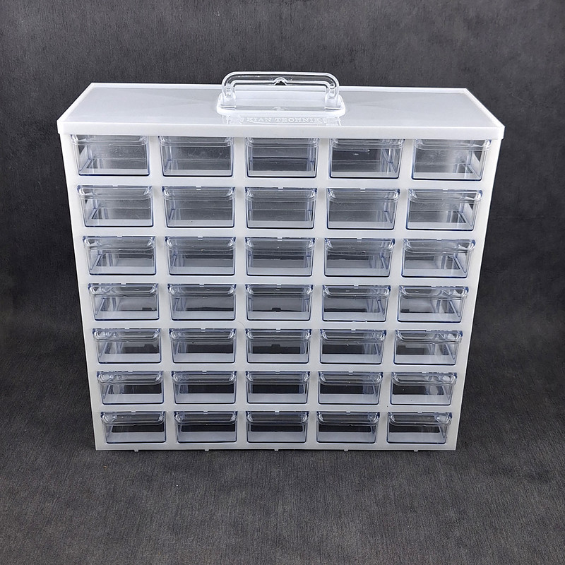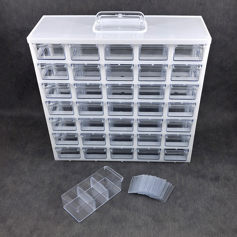 ست جا ادویه 35 پارچه کیان تکنیک مدل A07 ( 7 طبقه در 5 ردیف 35 کشویی ) محصولی است ایده آل برای نظم دادن به ادویه جات و سایز لوازم ریز از جمله لوازم خیاطی، خراطی و ... که با توانایی چیدمان بالا و راحتی استفاده ای که دارد نظم و آرامش را برای شما به ارمغان می آورد. این ارگانایزر محصولی ایده آل برای نظم دادن به محیط آشپزخانه، انبار، کارگاه، دفتر، تعمیرگاه، آزمایشگاه و ... است. این محصول مناسب قطعات ریز الکترونیکی مانند ال ای دی، خازن، مقاومت، ترانزیستور، آی سی و انواع و اقسام قطعات دیگر است. همچنین برای وسایلی دیگر مانند پیچ و میخ، کلید، دکمه، سوزن و هزاران قطعه ریز دیگر مناسب می باشد. با خرید این جعبه می توانید به محیط کار خود نظم دهید و به سرعت اقلام مورد نیاز خود را پیدا کنید. همچنین می توان از آن برای اهداف آموزشی نیز استفاده کرد. این باکس در قسمت بالایی دارای دسته ای برای سهولت جابجایی است. این جعبه قطعات از کیفیت بالایی برخوردار است و جنس بدنه آن پلاستیک ABS است و نسبت به محصولات مشابه ارزش خرید بالایی دارد. ابعاد این جعبه ارگانایزر 33x31x13 سانتی متر و ابعاد کشوهای آن 12x6x4 سانتی متر می باشد. ضمنا داخل کشوها تعدادی جدا کننده موجود است که برای جدا کردن ادویه ها و سایر لوازم کاربردی مورد استفاده قرار می گیرد.