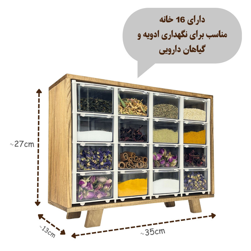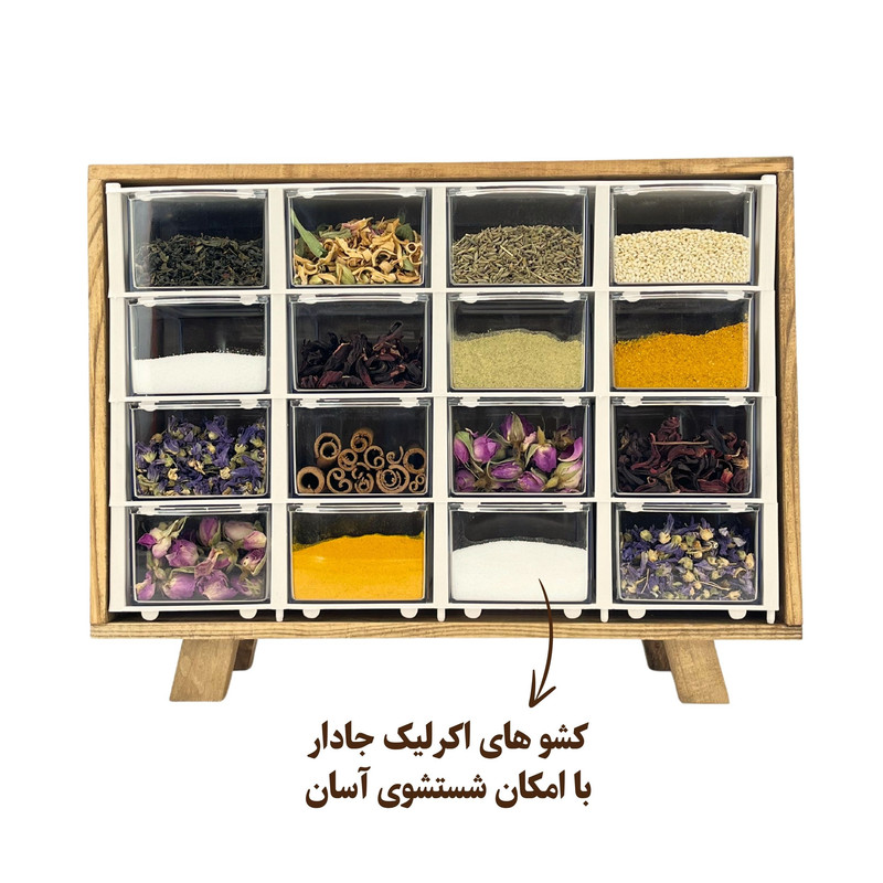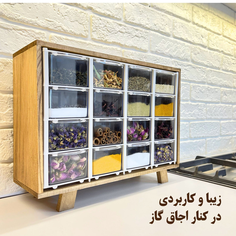 این جا ادویه چوبی 16 کشو، هدیهای است برای خودتان و یا کسانی که به دنبال نظم و زیبایی در آشپزخانه خود هستند. این محصول با طراحی مدرن و کارآمد، تمامی نیازهای شما برای نگهداری انواع ادویهجات و گیاهان دارویی را برطرف میکند.