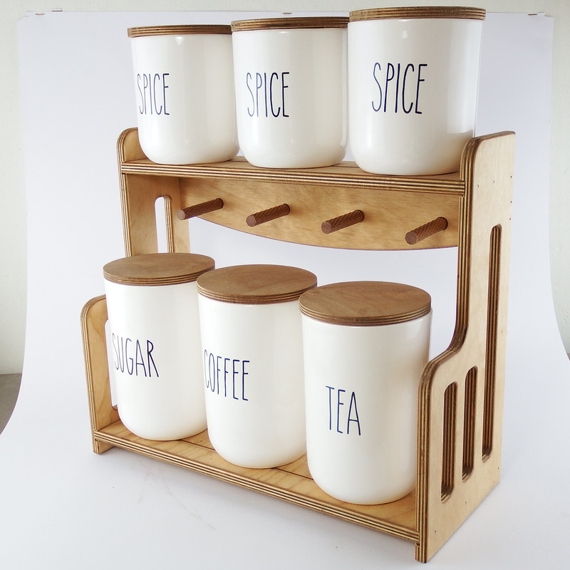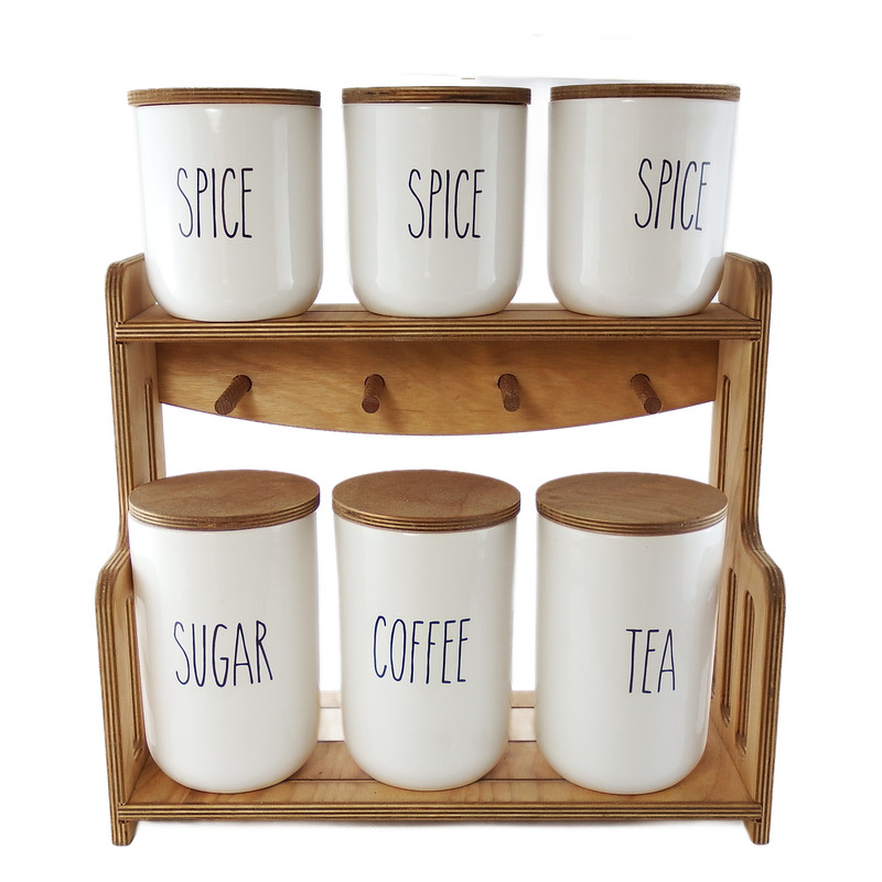 این ست جا ادویه تشکیل شده است از 6 عدد بانکه ( بدون واشر ) با قطر 11 سانتیمتر که 3 عدد آن به ارتفاع 17 سانتیمتر و 3 عدد آن به ارتفاع 13 سانتیمتر که دارای یک استند و دربهای چوبی از جنس پلی وود ضد آب با طراحی منحضر به فرد که هر بانکه در جایگاه خود قرار می گیرد