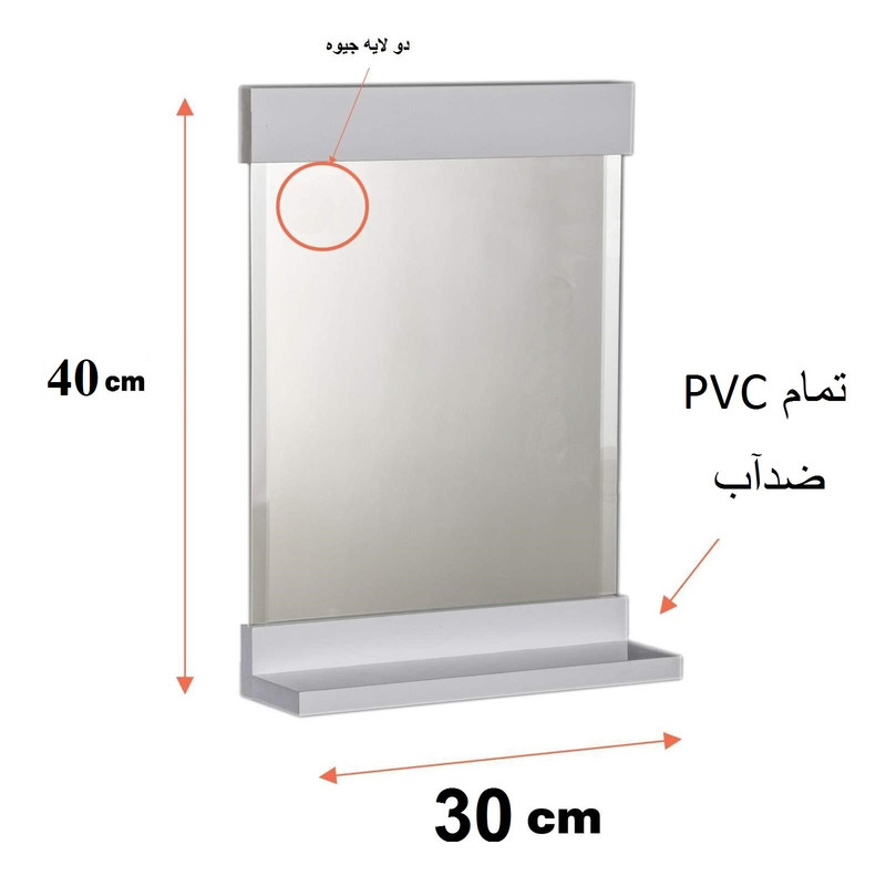 آیینه طبقه دار تمام PVC برند آزالیا دارای طبقه برای وسایل دکوری و جامسواکی میباشد. آیینه استفاده شده دو لایه جیوه و ورق مصرفی ضدآب تمام PVC هست مناس حمام و تمامی محیط های مرطوب میباشد . از رنگ ضد رطوبت پلی اورتان استفاده شده است. بر روی آیینه ها بست نصب دیوار قرار گرفته و به راحتی قابل نصب بر روی دیوار مورد نظر هست. سایز آیینه عرض 30 cm در ارتفاع 40 cm میباشد.