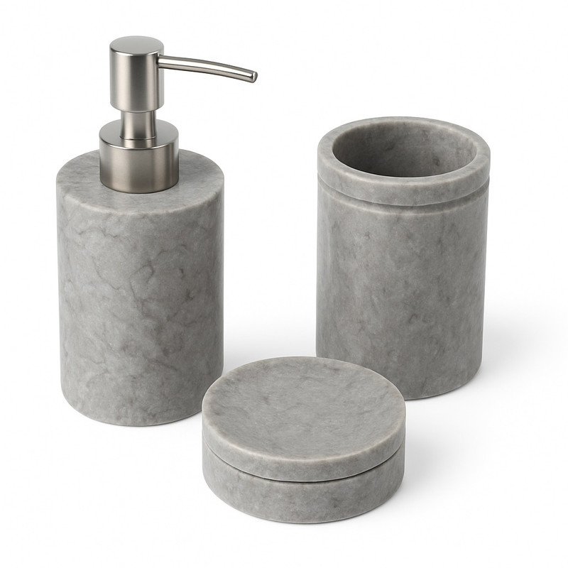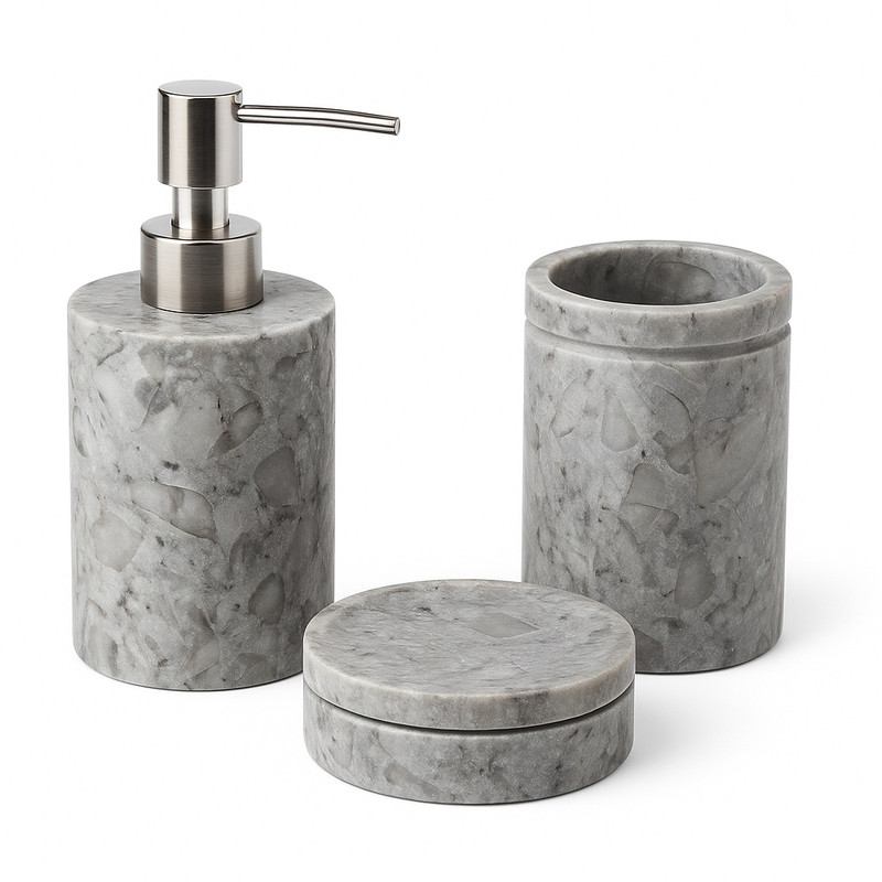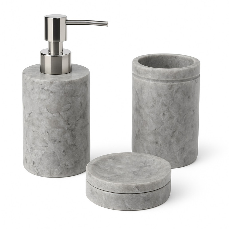 با این ست سرویس بهداشتی لوکس، جلوهای خاص به فضای حمام و دستشویی خود ببخشید. این مجموعه شامل جا مایعی، جا صابونی و جا مسواکی است که همگی با دقت و مهارت بالا از سنگ طبیعی تراش خوردهاند.