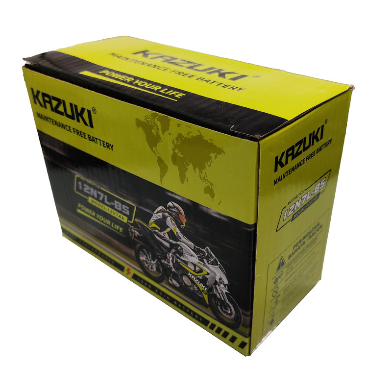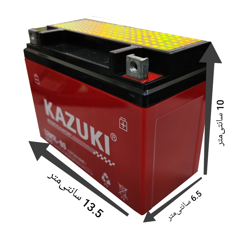 باتری 7 آمپر کوتاه برند کازوکی محصول کشور چین تحت لیسانس ژاپن ، با قدرت استارت بی نظیر و طول عمر مناسب و پایداری بالا، ابعاد باتری طول 13.5 سانتی متر و عرض 6.5 سانتی متر و ارتفاع 10.5 و وزن 2 کیلوگرم میباشد . این باتری مناسب موتور های هوندا 125 و 150 و 200 و تمام موتور هایی که جا باطری آن ها این ابعاد هست میباشد. باتری های دارای الکترولیت ژل و اتمی به سبب ویژگیهایی که دارند، تقریبا نیاز به نگهداری ندارند و همچنین به دلیل داشتن صفحات محکم و بهره بردن از لایه های فایبرگلاس، از مقاومت بالایی در برابر حالت های ارتعاشی برخوردار هستند. همچنین تکنولوژی بکارگرفته شده در ساخت این محصول باعث شده تا باتری 7 امپر کازوکی براحتی از پس وظایف روزمره برآید و با ایستادگی در دماهای پایین حتی در روزهای سرد زمستان، بدون هیچ مشکلی و براحتی، جریان مصرفی استارت موتورسیکلت و سخت افزارهایی همچون بوق، دزدگیر و ... را تامین نماید. دقت داشته باشید ، بعد از نصب باتری ، حتما شارژر موتور را بعد از مراجعه به یک شخصص متخصص تست نمایید و عدد نشان دهنده بین 13 الی 14.5 باشد . همچنین سعی کنید به صورت حداقل سه روز یک بار موتور را روشن کرده ، تا باتری شارژ شود.