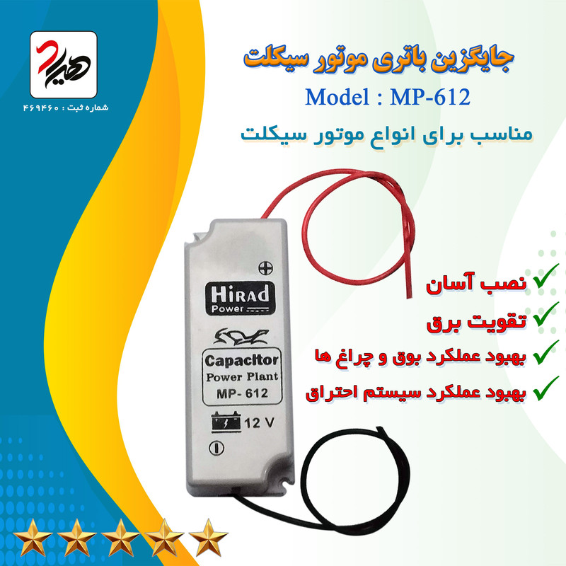 جایگزین باطری موتور سیکلت هیراد مدل MP-612 قطعه ای الکترونیکی می باشد که برق تولید شده توسط بوبین یا مولد برق موتور سیکلت را در خود ذخیره و به صورت صاف شده و تقویت شده به سیستم برق موتور سیکلت انتقال می دهد . این قطعه برای افرادی که نمیخواهند برای موتور سیکلت خود باتری بخرند مناسب می باشد . جایگزین باتری برای بهبود عملکرد قطعات برقی موتور سیکلت مانند بوق ، چراغ های راهنما و چراغ جلو مناسب بوده و از نوسان برق آنها جلوگیری می کند . همچنین باعث افزایش عمر قطعات برقی موتور مانند چراغ ها و غیره نیز می شود . توجه داشته باشید که جایگزین باطری توانایی تامین برق مورد نیاز استارت را ندارد. نصب این قطعه بسیار آسان است . این قطعه را به جای باتری در نظر گرفته و سیم قرمز را به مثبت و سیم مشکی را به منفی یا بدنه موتور سیکلت متصل نمایید. بعد از نصب سر سیم ها را به خوبی عایق بندی کنید .