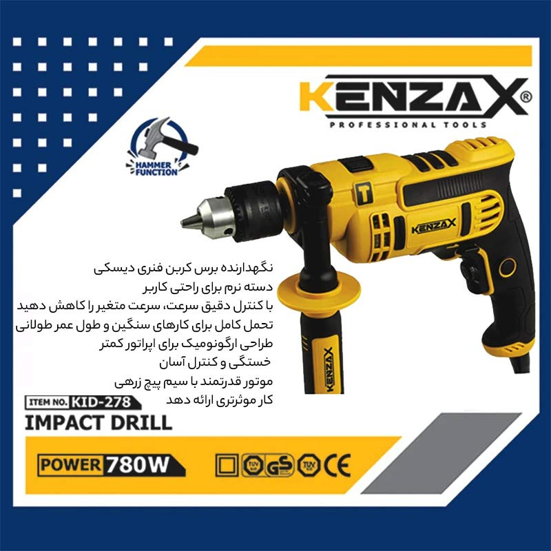 محصول فوق یکی دیگر ازمحصولات برقی تولیدی شرکت «کنزاکس» (Knzax) میباشد. امروزه برای سوراخ کردن اجسام مختلف، از انواع دریلهای برقی یا شارژی استفاده میکنند. کار با این دستگاه کار چندان مشکلی نیست و نیاز به کسب مهارت خاصی ندارد. با توجه به میل افراد جامعه به انجام کارهای فنی در منزل، در بسیاری از خانهها نمونهای از این دستگاه دیده میشود. دریلها انواع مختلفی دارند و انرژی موردنیاز خود را از برق یا باتری میگیرند. با استفاده از دریلهای معمولی قادر به سوراخ کردن اجسامی از جنس چوب، پلاستیک یا فلزات هستید. اما با این دریل که قابلیت سوراخ کاری در حالت چکشی را داراست علاوه بر این موارد، دیوار، سرامیک و انواع مصالح ساختمانی را میتوانید سوراخ کنید. دریل چکشی کنزاکس ابزاری مناسب برای سوراخکاری در انواع سطوح چوبی و فلزی و مصالح ساختمانی می باشد.پس از عرضه دریل چکشی کنزاکس مدل KID-178 ؛ درخواست های بسیاری به شرکت کنزاکس رسید که این مدل را به همراه کیف قابل حمل عرضه نماید . پس بر آن شدیم که کالای مورد درخواست مشتریان را نیز فراهم نماییم که با عنوان KID-278 به بازار عرضه میگردد . کیف BMC با کیفیت با قفل فلزی این محصول را بسیار پر طرفدار کرده است . خود این دریل چکشی حدود 2 کیلوگرم وزن دارد و در ابعاد کوچک 28 × 20 × 7 سانتیمترتولید شده است که با کیف BMC وزنی معادل 3.300 کیلو خواهد داشت . ابعاد کیف 35 × 33 × 10 سانتیمتر میباشد . با توجه با استفاده از سه نظام فلزی مارک پیکاک حداکثر قطر سوراخکاری آن در دیوار 13 میلیمتر, چوب 25 میلیمترو در فلز 10 میلیمتراست. این دستگاه از سیستم گردشی راستگرد و چپ گرد بهره میبرد. و حالت سوراخ کاری معمولی و ضربهای را فراهم میسازد. منبع تغذیهی این دریل، برق شهری است و با ولتاژ ورودی 220 ولت کار میکند. توان خروجی این ابزار 780 وات است و میتواند با سرعت گردش حداکثر 2800 دور در دقیقه به سوراخکاری بپردازد. برای سهولت در سوراخکاری، دستهای کمکی با روکش نرم در قسمت جلویی دستگاه قرار دارد و از یک خط کش که عمق سوراخ کاری را تنظیم می کند بهره می برد. شرکت کنزاکس که همیشه در تولید ابزار های صنعتی نوآور است این محصول را تحت عنوان مدل «KID-278» به بازار عرضه میکند. این دریل مخصوص کار روی فلزات ، انواع چوبها ، PVC ، مصالح بنایی از قبیل دیوار و بتن ...