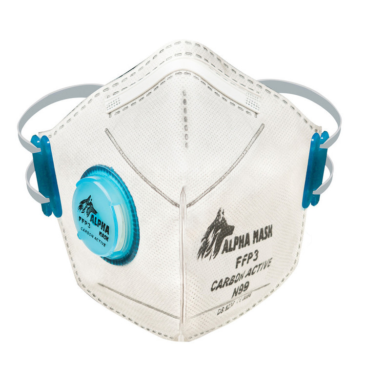 نقاط قوت ماسک آلفا ماسک P3 N99 فیلتراسیون ۹۹٪ ذرات معلق طراحی سهبعدی و ارگونومیک خط تقویتی ضد دفرمه شدن سوپاپ پرس برای خروج راحت هوا مناسب محیطهای صنعتی و آلوده
