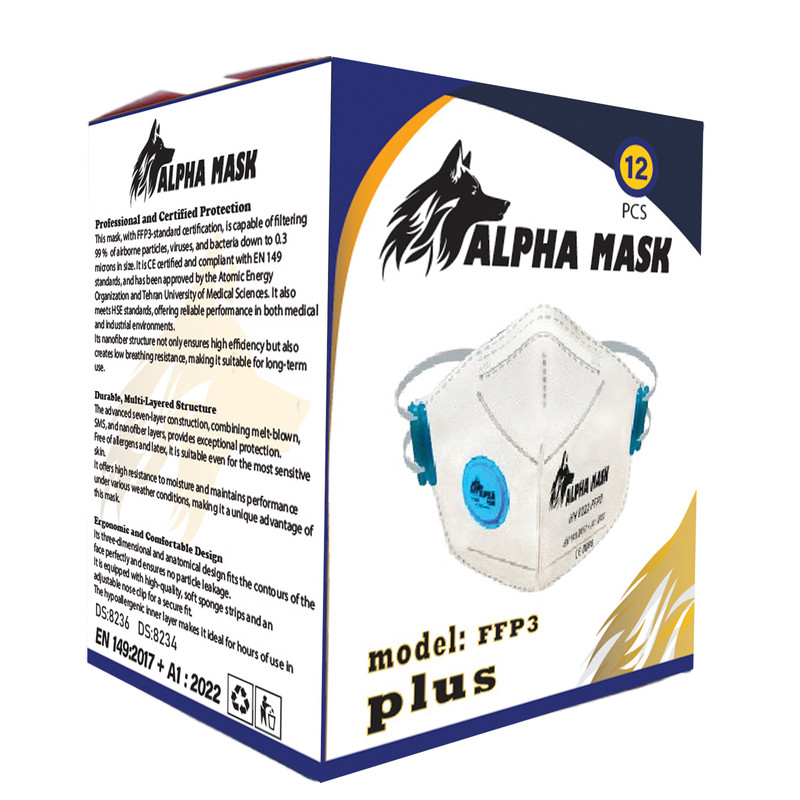 نقاط قوت ماسک آلفا ماسک P3 N99 فیلتراسیون ۹۹٪ ذرات معلق طراحی سهبعدی و ارگونومیک خط تقویتی ضد دفرمه شدن سوپاپ پرس برای خروج راحت هوا مناسب محیطهای صنعتی و آلوده